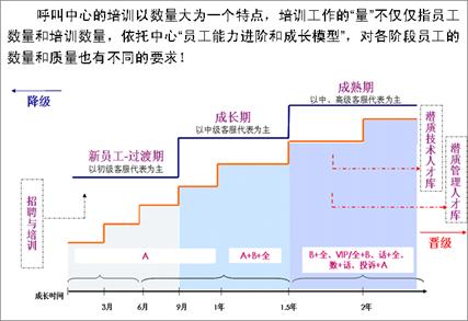 業(yè)務(wù)模塊化后,客服中心對(duì)一線客服代表進(jìn)行分級(jí)認(rèn)證,針對(duì)簡(jiǎn)單業(yè)務(wù)和復(fù)雜業(yè)務(wù)分別設(shè)置首層和二線專席兩類共計(jì)8種人員承接梯隊(duì),達(dá)到業(yè)務(wù)與人員的全匹配。人員梯隊(duì)的設(shè)置對(duì)人員的培訓(xùn)管理和進(jìn)出機(jī)制提出了新的挑戰(zhàn),如何科學(xué)界定不同隊(duì)列人員的技能標(biāo)準(zhǔn)?如何設(shè)置不同成長(zhǎng)時(shí)期員工的進(jìn)出管理機(jī)制?