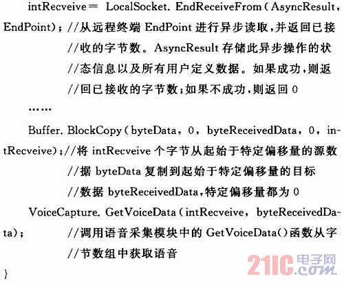 數(shù)據(jù)接收函數(shù)的功能主要是調用GetVoiceData()函數(shù)從網絡中接收語音數(shù)據(jù)并放入緩沖區(qū)。代碼如下: