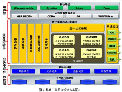 移動工單系統(tǒng)是在Windows Mobile智能手機操作系統(tǒng)上自主研發(fā),采用B/S和C/S混合架構,以TCP/IP作為基礎數據傳輸協議,通過移動通信網絡無線數據通道GPRS/EDGE/CDMA1x等,將呼叫中心的工單數據推送到智能手機上,由外勤服務人員將服務情況進行實時的反饋。利用的同步中間件可將最新的資訊文件推送到手機終端上,服務人員無需登錄即可在終端可以查看最新的廣電資訊,可支持doc、xls、ppt等 Office文檔格式的瀏覽,支持WMV、WAV、3GP多種音視頻文件播放。服務人員可以不受地點和時間的限制通過終端實時獲取最新的多媒體客戶交互中心運營數據報表,圖2為系統(tǒng)設計方案圖。