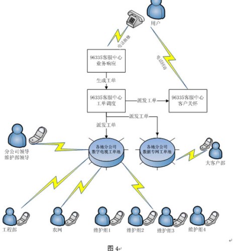 用戶致電96335呼叫中心的工單,由96335的中心處理席根據工單反應的細節(jié)分派到各個服務站,移動實時工作流根據預先設定的工作流程和條件流轉到相關的處理人,服務人員在移動智能手機終端的客戶端軟件可以查詢他所要辦理的工單,已經完成辦理的工單,根據工單的詳細內容上門為用戶解決問題,并通過客戶端軟件填寫問題處理的結果。由移動實時工作流將處理結果按預設的流程反饋到呼叫中心節(jié)點,呼叫中心的回復席根據處理結果對用戶進行服務的回訪并將工單歸檔,完成一個閉環(huán)的服務流程。
