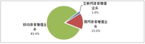 按網(wǎng)絡(luò)接入方式分類,語(yǔ)音增值業(yè)務(wù)可以分為固網(wǎng)語(yǔ)音增值業(yè)務(wù)、移動(dòng)語(yǔ)音增值業(yè)務(wù)和互聯(lián)網(wǎng)語(yǔ)音增值業(yè)務(wù)三種。市場(chǎng)占有比例分別是:固網(wǎng)語(yǔ)音增值業(yè)務(wù)占15%,移動(dòng)語(yǔ)音增值業(yè)務(wù)占83.4%,互聯(lián)網(wǎng)語(yǔ)音增值業(yè)務(wù)占1.6%。如下圖所示: