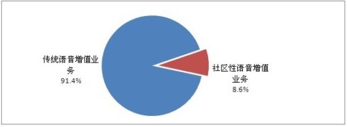 目前,新業(yè)務(wù)模式仍在探索階段,市場(chǎng)仍以傳統(tǒng)語(yǔ)音增值業(yè)務(wù)為主。在中國(guó)語(yǔ)音增值業(yè)務(wù)市場(chǎng)中,傳統(tǒng)語(yǔ)音增值業(yè)務(wù)占91.4%,其中主要份額來(lái)自移動(dòng)通信網(wǎng);社區(qū)性語(yǔ)音增值業(yè)務(wù)占8.6%,其中主要份額來(lái)自固網(wǎng)。如下圖所示:
