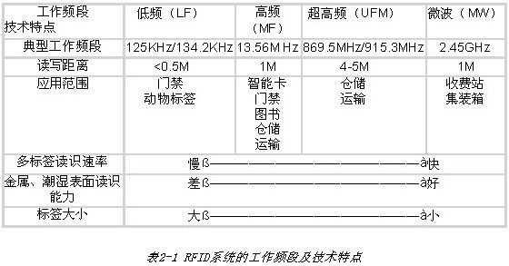 RFID系統(tǒng)的工作頻段可以為低頻(LF)(30-300kHz,典型頻率有125 kHz,134.2 kHz)、高頻(HF)(3-30MHz,典型頻率為13.56M Hz)、超高頻(UHF)(300-968MHz,典型頻率869.6MHz、915.3MHz)、微波(MW)(2.45-5.8GHz,典型頻率為2.45GHz)等四個頻段,具體的頻點(diǎn)由各個國家或地區(qū)的無線電管理部門確定。根據(jù)不同的工作頻段,在無源的情況下,其技術(shù)特點(diǎn)和應(yīng)用范圍也不同,如下表所示: