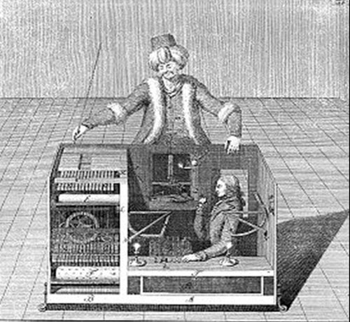 這個(gè)名字源自于臭名遠(yuǎn)揚(yáng)的能下象棋的“自動(dòng)裝置”,它是匈牙利男爵沃爾夫?qū)ゑT·肯佩倫(Wolfgang Von Kempelen)1770年建造的。這個(gè)木制機(jī)器外形像一個(gè)坐在大機(jī)箱前的土耳其魔法師,它能自動(dòng)而快速地下象棋,用復(fù)雜的齒輪和杠桿系統(tǒng)來(lái)移動(dòng)棋子。在維也納皇宮的首次表演中,它就迅速擊敗了對(duì)手Cobenzl伯爵,讓在場(chǎng)的皇室成員看得十分高興。從此關(guān)于這個(gè)驚人聰明的機(jī)器人迅速聞名于世,于是肯佩倫帶著它在歐洲各地表演,擊敗了一系列著名的挑戰(zhàn)者,包括拿破侖和本杰明·富蘭克林。直到幾年之后,這個(gè)騙局才被揭穿。原來(lái)機(jī)箱里藏了一名象棋大師,他用一個(gè)磁鐵系統(tǒng)來(lái)跟蹤對(duì)手的舉動(dòng)并移動(dòng)自己的棋子,這個(gè)人實(shí)際是在模擬一種人工智能。(摘錄自 比特云 )
