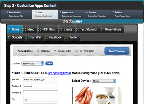 Bizness Apps采用可視化操作界面,用戶只需要點擊設置相關選項就能完成應用的開發(fā)工作。因此,Bizness Apps很適合缺少專業(yè)技術人員的小企業(yè)開發(fā)本行業(yè)應用。利用Bizness Apps開發(fā)行業(yè)應用只需五步。首先,開發(fā)者選擇對應的行業(yè)后,需要為應用添加功能組件。第二步,為訂制好的功能組件添加內容。第三步,為應用選定外觀的設計方案。第四步,預覽經(jīng)過定制后的應用。最后,完成付費后即可發(fā)布你的應用。
