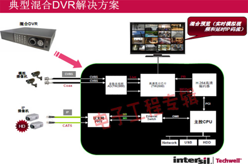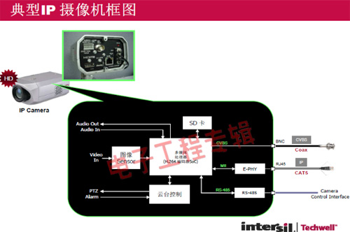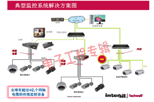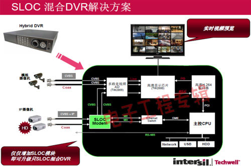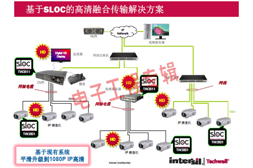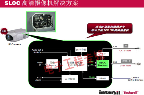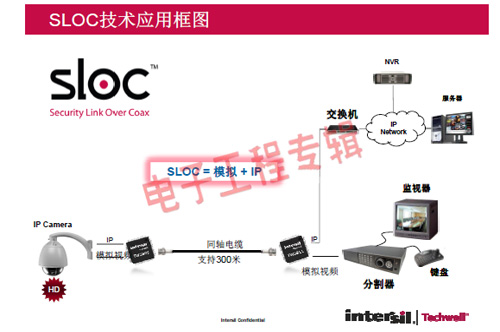 革命性的Intersil Techwell SLOCTM(Security Link over Coax)同軸電纜復(fù)合視頻傳輸解決方案是可通過一條同軸電纜同時傳輸模擬 CVBS 視頻和高清數(shù)字 IP 視頻信號的先進(jìn)調(diào)制解調(diào)器解決方案,其采用最新MODEM PHY技術(shù)的傳輸解決方案,可以基于同軸電纜同時傳輸高清IP碼流和標(biāo)清模擬實(shí)時視頻。
