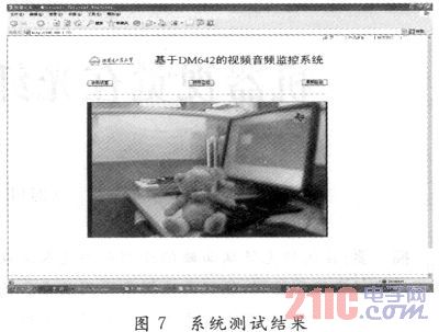 在集成開發(fā)環(huán)境CCS(C6000)下,加載相關(guān)驅(qū)動(dòng)程序,對本系統(tǒng)進(jìn)行了測試。CCD攝像頭為標(biāo)準(zhǔn)PAL制式,圖像采集的幀頻為25幀/s,圖像的分辨率為720×576像素。測試結(jié)果如圖7所示。測試結(jié)果表明,網(wǎng)絡(luò)連接正常,用戶在PC端可通過瀏覽器訪問系統(tǒng),成功實(shí)現(xiàn)遠(yuǎn)程監(jiān)控。