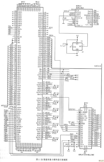 BT8474是一個PCI多功能設(shè)備。本系統(tǒng)中,其功能0實(shí)現(xiàn)鏈路層的控制;功能1完成物理層的控制。BT8474是由1個主接口、4個串口、1個EBUS端口和1個邊界掃描口構(gòu)成。主接口通過PCI的兩個功能配置區(qū)找到基地址寄存器,系統(tǒng)根據(jù)訪問的地址值決定選擇的功能;串行接口完成主接口和物理接口器件的數(shù)據(jù)傳輸;EBUS端口通過內(nèi)置的MPU(微處理器單元)來擴(kuò)展外圍設(shè)備,物理接口器件BT8370是一個T1/E1收發(fā)成幀器,可支持LineRate為1.544 Mb/s(T1)或者2.048 Mb/s(E1)的收發(fā)接口。物理線性接口電路恢復(fù)來自于電纜的“+3 dB~-43 dB”的模擬時鐘和數(shù)據(jù)。圖1給出了E1數(shù)據(jù)采集卡硬件設(shè)計(jì)原理圖。
