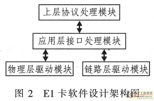 E1采集卡軟件設(shè)計(jì)架構(gòu)主要由鏈路層驅(qū)動模塊、物理層驅(qū)動模塊、應(yīng)用層接口處理模塊和上層協(xié)議處理模塊組成,如圖2所示。驅(qū)動程序是數(shù)據(jù)采集卡的基礎(chǔ),它負(fù)責(zé)E1接口數(shù)據(jù)采集和數(shù)據(jù)重組,并通過共享內(nèi)存與PC機(jī)實(shí)現(xiàn)數(shù)據(jù)交互,以及控制指令動作和硬件狀態(tài)報(bào)告等。