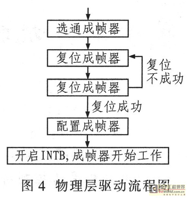 物理層通過地址總線映射配置成幀器,其中PCI橋設(shè)備和成幀器之間經(jīng)過CPLD控制選通。物理層驅(qū)動完成配置成幀器、復(fù)位控制等。成幀器是將E1上的比特流整合成符合規(guī)范的HDLC幀,其中一個標(biāo)準(zhǔn)HDLC幀包括32個時隙,這些時隙可配置映射到HDLC控制器的端口信道,實(shí)現(xiàn)2 M、N×64 K、N×8 K高速模式。其配置流程如圖4所示。