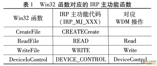 在Windows中,應(yīng)用程序與WDM通信的實(shí)現(xiàn)過程:應(yīng)用程序應(yīng)先獲得設(shè)備句柄GUID碼,然后利用CreateFile函數(shù)打開設(shè)備,通過 DeviceIoControl函數(shù)傳遞控制代碼參數(shù)和WDM進(jìn)行通信,包括從WDM中讀取數(shù)據(jù)和寫數(shù)據(jù)給WDM兩種情況,也可利用ReadFile從 WDM中讀取數(shù)據(jù)或用WriteFile寫數(shù)據(jù)給WDM:當(dāng)下層驅(qū)動有觸發(fā)事件時,就需要Event事件通知上層軟件。當(dāng)應(yīng)用程序退出時,CloseHandle則關(guān)閉設(shè)備,這將產(chǎn)生對應(yīng)于此設(shè)備對象的相應(yīng)IRP消息。這種關(guān)系如表1所列。