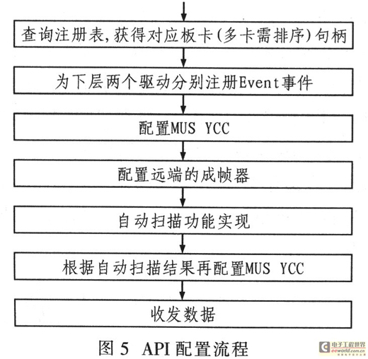 由于E1數(shù)據(jù)采集卡的MUSYCC控制器是PCI多功能設(shè)備,所以應(yīng)用程序應(yīng)當(dāng)合理調(diào)整兩個功能驅(qū)動程序的控制順序,實(shí)現(xiàn)E1數(shù)據(jù)的正常采集。其E1卡應(yīng)用程序(API)的配置流程如圖5所示。