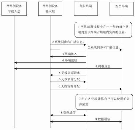 (6)網(wǎng)絡(luò)側(cè)設(shè)備接入層向組長終端發(fā)布分配給該終端組的無線資源。