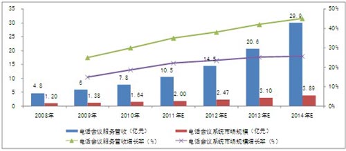 圖表 4 2008-2014年中國(guó)電話(huà)會(huì)議市場(chǎng)規(guī)模及增長(zhǎng)率