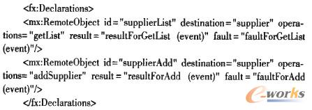 客戶層采用Flex4的Spark UI組件和ActionScript分別實(shí)現(xiàn)MVC模式的View和Control層,實(shí)現(xiàn)與系統(tǒng)用戶的交互,并通過Spring BalazeDs集成框架發(fā)布的Remote Object,實(shí)現(xiàn)與業(yè)務(wù)層對(duì)象的通訊,進(jìn)而完成CRM業(yè)務(wù)處理。如下代碼為Flex中聲明Remote Object: