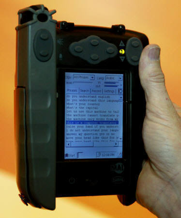 這款Marine Acoustics于2003年4月22日在舊金山的嵌入式系統(tǒng)會議(Embedded Systems Conference)上展示的新型語言翻譯機(jī),采用微軟CE系統(tǒng),可讓使用者對著機(jī)器說話,再將整句話翻成別國語言發(fā)聲,可做為隨身攜帶的移動(dòng)翻譯機(jī)。目前美國軍方已采用數(shù)百部,配備給派駐在阿富汗以及伊拉克的美軍使用。