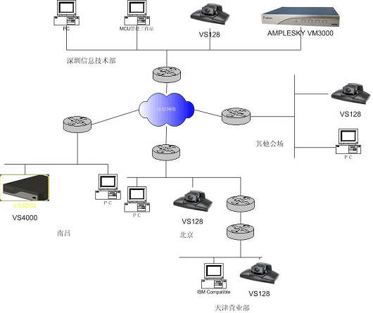 整個(gè)系統(tǒng)構(gòu)建在江南證券有限責(zé)任公司廣域網(wǎng)上,江南證券有限責(zé)任公司廣域網(wǎng)骨干帶寬為512K,江南證券有限責(zé)任公司視頻會議系統(tǒng)可以使用足夠的帶寬。江南證券有限責(zé)任公司視頻會議系統(tǒng)拓?fù)鋱D結(jié)構(gòu)如下: