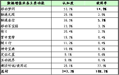 數(shù)據(jù)增值業(yè)務(wù)品牌認(rèn)知度較高的是移動(dòng)夢(mèng)網(wǎng)、聯(lián)通無限等,而使用率很低