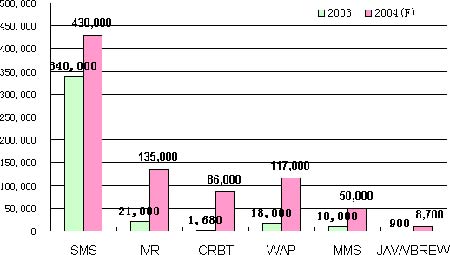 短信業(yè)務(wù)是各類移動增值業(yè)務(wù)中用戶量最多的新業(yè)務(wù),2003年已達(dá)到1.4億,WAP、IVR和CRBT業(yè)務(wù)2004年都取得高速增長。其中WAP用戶規(guī)模達(dá)到2500萬,其市場規(guī)模由2003年的1.8億元增長為2004年的11.7億元。