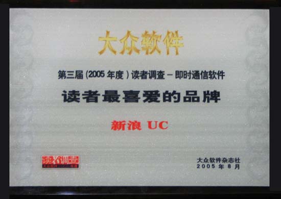 8月24日,在國內(nèi)知名IT媒體《大眾軟件》創(chuàng)刊10周年慶典上,《大眾軟件》隆重公布了“《大眾軟件》第三屆(2005年度)讀者調(diào)查報(bào)告”,新浪UC以12.20%的市場占有率,逼近排名第二的MSN(17.81%),實(shí)至名歸在國內(nèi)IM市場獲得第三的成績,并獲得《大眾軟件》頒發(fā)的“第三屆(2005年度)讀者調(diào)查——即時(shí)通訊軟件”市場“讀者最喜愛的品牌”(圖一)。
