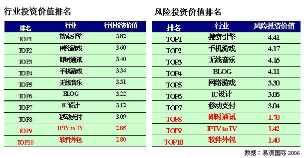 搜索引擎行業(yè)投資潛力最大,無論是行業(yè)投資價(jià)值還是風(fēng)險(xiǎn)投資價(jià)值均名列第一。網(wǎng)絡(luò)游戲行業(yè)兩方面投資潛力均具備,但由于行業(yè)面臨整合,致使風(fēng)險(xiǎn)投資價(jià)值略遜。隨著 3G 牌照的發(fā)放,手機(jī)游戲、無線音樂、移動(dòng)支付、博客等行業(yè)投資潛力都將有所提高,其中手機(jī)游戲、無線音樂和博客分別列居第二、第三、第四,成為未來三年中高增長(zhǎng)行業(yè)。即時(shí)通訊行業(yè)投資價(jià)值排名第三,由于其商業(yè)模式的低創(chuàng)新,致使其風(fēng)險(xiǎn)投資價(jià)值僅為倒數(shù)第三,不具備風(fēng)險(xiǎn)投資價(jià)值。隨著汽車行業(yè)、消費(fèi)電子行業(yè)逐步向智能化、數(shù)字化發(fā)展,IC 設(shè)計(jì)行業(yè)將成為半導(dǎo)體行業(yè)風(fēng)險(xiǎn)投資追逐的新星并具有相當(dāng)?shù)拈L(zhǎng)期行業(yè)投資價(jià)值。在十個(gè)行業(yè)中,IPTV 和軟件外包行業(yè)三年內(nèi)的投資價(jià)值最低。