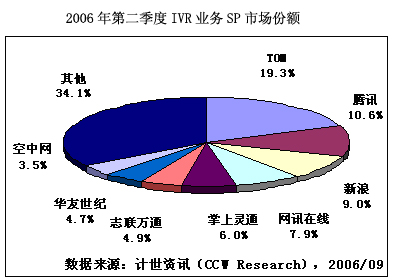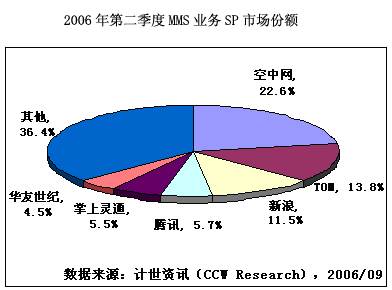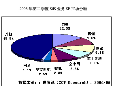 計世資訊(CCW Research)調研顯示。2006年第二季度,中國SMS業(yè)務市場規(guī)模達到118.3億元人民幣,其中SP收入12.1億元人民幣。TOM、騰訊和新浪排名前三位,分別占12.5%、9.6%和9.1%。其次為掌上靈通和空中網(wǎng),占8.6%和8.3%。