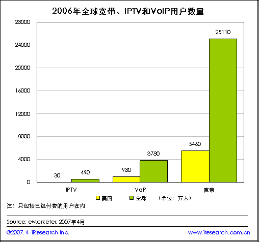 iResearch艾瑞市場(chǎng)咨詢根據(jù)eMarketer最新的數(shù)據(jù)發(fā)現(xiàn),寬帶上網(wǎng)環(huán)境為一些列的寬帶平臺(tái)應(yīng)用產(chǎn)品創(chuàng)造了良好的使用環(huán)境,各種服務(wù)同步發(fā)展起來。隨著全球?qū)拵в脩魯?shù)量的逐漸增加,全球IPTV和VoIP用戶也迅速成長(zhǎng)。到2006年全球?qū)拵в脩暨_(dá)到2.511億人,VoIP和IPTV的全球用戶數(shù)量也分別達(dá)到了3780萬(wàn)人和490萬(wàn)人。