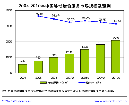 2006年我國移動通信市場發(fā)展態(tài)勢依然良好,雖然用戶規(guī)模增長有所趨緩,但移動通話量仍快速增長,尤其是增值業(yè)務將會在移動通信收入比例上升,而且移動增值業(yè)務種類不斷豐富、收入貢獻日益增加,移動通信對固定通信的替代日益明顯。隨著中國3G商用的日益臨近和2008年北京奧運會的到來,中國移動通信業(yè)將會呈現快速增長,預計未來移動增值業(yè)務的增長比重將會逐漸提升,成為移動通信業(yè)增長的主要動力。