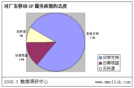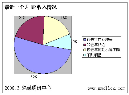 最近公布的空中網(wǎng)財務報表的數(shù)據(jù)顯示空中網(wǎng)總收入環(huán)比增長,結合之前廣東移動推出:廣東移動向重服務轉變 首推“6+1”服務,SP行業(yè)可以說是暖風頻吹。魅媒無線行業(yè)調研中心隨機從3月3日到3月5日隨記電話采訪50多家全網(wǎng)以及廣東省網(wǎng)SP公司相關負責人,對最近的SP行業(yè)的政策調整進行調查,有以下的數(shù)據(jù):