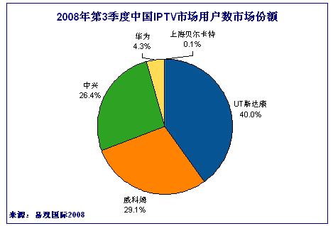 根據(jù)易觀國際(Analysys International)的研究顯示,2008年第3季度廠商的競(jìng)爭(zhēng)格局方面沒有顯著變化,中國IPTV市場(chǎng)主要廠商情況如下: