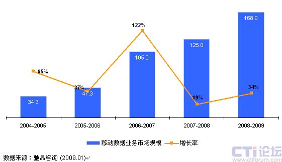 2008年中國(guó)移動(dòng)數(shù)據(jù)業(yè)務(wù)市場(chǎng)規(guī)模達(dá)168億美元