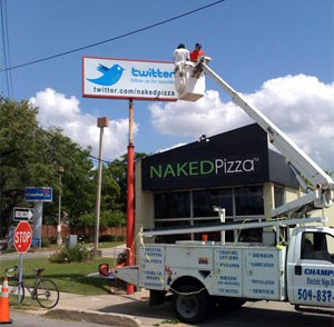 繼華爾街日?qǐng)?bào)、紐約時(shí)報(bào)、英國(guó)衛(wèi)報(bào)等報(bào)紙利用起Twitter后,最近,據(jù)Techcrunch網(wǎng)站消息稱(chēng),美國(guó)新奧爾良名為NakedPizza的比薩店,不僅在Twitter上注冊(cè)了帳號(hào),而且拆除了之前標(biāo)有訂餐電話(huà)的店前廣告牌,取而代之的是一塊以Twitter為主題的新廣告牌。