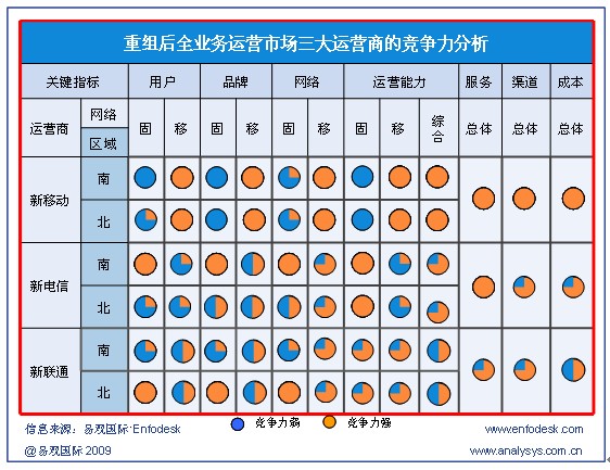 盡管產(chǎn)業(yè)鏈完備程度相差較為明顯,但運(yùn)營商各自業(yè)務(wù)與用戶服務(wù)運(yùn)營能力對3G時常的發(fā)展影響也至關(guān)重要,根據(jù)易觀國際Enfodesk發(fā)布的《國內(nèi)運(yùn)營商3G業(yè)務(wù)發(fā)展策略研究系列—中國3G市場現(xiàn)狀與發(fā)展策略概述》報告顯示,在發(fā)展3G的過程中,三大運(yùn)營商各自有一定的優(yōu)劣勢: