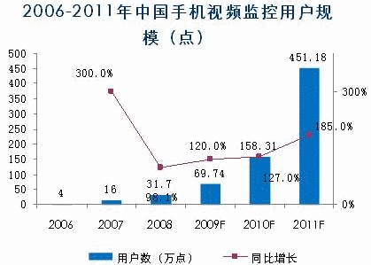 諾達(dá)咨詢預(yù)測(cè),2006年中國(guó)手機(jī)監(jiān)控用戶以4萬(wàn)點(diǎn)計(jì)算,2009年隨著運(yùn)營(yíng)商3G網(wǎng)絡(luò)建設(shè)和3G業(yè)務(wù)的推進(jìn),用戶數(shù)將有大幅度增長(zhǎng),2010年用戶將達(dá)到158.31萬(wàn)點(diǎn),2011年達(dá)到451.18萬(wàn)點(diǎn)。