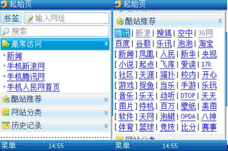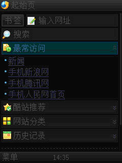 首先,起始頁(yè)非常簡(jiǎn)潔,只有書(shū)簽、網(wǎng)址輸入框、搜索框、最常訪問(wèn)、酷站推薦、網(wǎng)站分類、歷史紀(jì)錄幾個(gè)功能。在酷站推薦中,前幾位是騰訊、新浪、搜狐、空中、3G門(mén)戶、百度等常用網(wǎng)址。