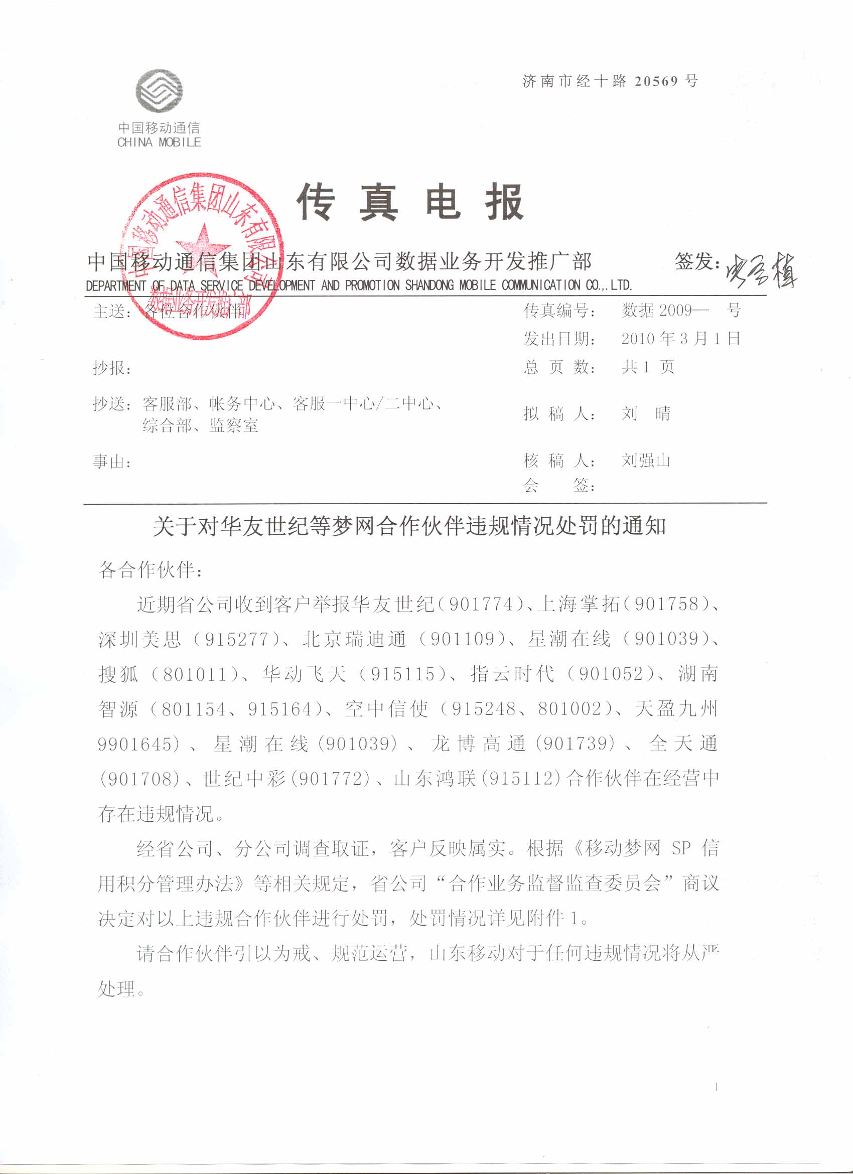| 11 | 天盈九州 | 901645 | 10665106 | 該公司“愛情私語(yǔ)”業(yè)務(wù),使用漢字標(biāo)價(jià),且資費(fèi)提示不明顯。 | 暫停該公司“愛情私語(yǔ)”業(yè)務(wù)(業(yè)務(wù)代碼:YYAQSY)在山東地區(qū)的服務(wù)1個(gè)月?鄢庞梅e分5分。 |