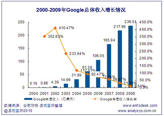從谷歌的總體營(yíng)收增長(zhǎng)情況可以看出,谷歌雖然保持了相對(duì)平穩(wěn)的整體營(yíng)收增長(zhǎng)態(tài)勢(shì),但是其增長(zhǎng)速率已經(jīng)從2001、2002年超過300%的高速增長(zhǎng)降低到2009年的8.54%。整體來看,谷歌的營(yíng)收增長(zhǎng)能力已經(jīng)大幅度降低,減緩收入下滑速度的業(yè)務(wù)發(fā)展壓力下,谷歌需要拓展新的市場(chǎng)以重新構(gòu)建業(yè)務(wù)的高速增長(zhǎng)。