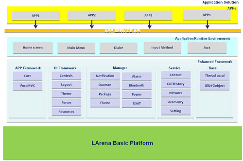 LARENA3.0是聯(lián)芯科技自主研發(fā)的高度可配置、可擴(kuò)展、開放性的業(yè)內(nèi)主流手機(jī)應(yīng)用平臺(tái),它集通信、多媒體和移動(dòng)互聯(lián)網(wǎng)功能于一體,實(shí)現(xiàn)了完整的應(yīng)用生命周期管理和動(dòng)態(tài)加載能力,充分體現(xiàn)了TD-SCDMA特有創(chuàng)新技術(shù),并支持多種業(yè)務(wù)能力,提供豐富的工具套件。