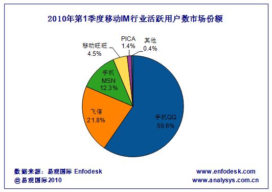據(jù)易觀國際Enfodesk產(chǎn)業(yè)數(shù)據(jù)庫近期發(fā)布的《2010年第1季度中國市場移動IM數(shù)據(jù)監(jiān)測報告》研究顯示:2010年第1季度中國市場移動IM活躍用戶數(shù)環(huán)比增長超過18%,總數(shù)突破1.6億,累計賬戶數(shù)環(huán)比增長10.97%,總數(shù)超過3.8億,相比09年第4季度依然取得了較快的增長。但是基于整體市場來看,移動IM活躍用戶數(shù)市場格局并沒有發(fā)生太大變化,手機QQ仍然以59.6%的市占率名列市場第一,飛信、手機MSN位列二三名,具體市場占比及排名如下圖所示: