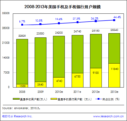 艾瑞咨詢根據(jù)eMarketer的統(tǒng)計數(shù)據(jù)發(fā)現(xiàn),2010年美國手機銀行用戶占其手機用戶的比例將達到19.6%,到2013年將增長至44.4%。