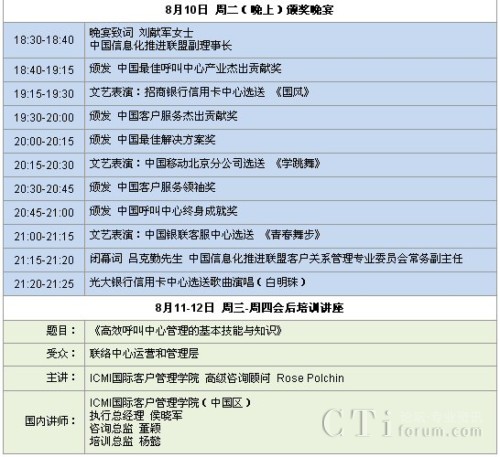 CTI論壇(ctiforum)8月3日消息(記者 潘婷婷):“第八屆中國(guó)呼叫中心產(chǎn)業(yè)高峰論壇暨第八屆中國(guó)最佳呼叫中心及最佳管理人頒獎(jiǎng)大會(huì)”定于2010年8月10日在上海國(guó)際貴都大飯店召開(kāi)。此次大會(huì)是由中國(guó)信息化推進(jìn)聯(lián)盟客戶關(guān)系管理專業(yè)委員會(huì)主辦,ICMI國(guó)際客戶管理學(xué)院(中國(guó)區(qū))承辦。通過(guò)本次大會(huì),與會(huì)者將獲得中國(guó)最佳呼叫中心實(shí)踐經(jīng)驗(yàn)和最佳解決方案的分享,與業(yè)界精英共話呼叫中心和客戶關(guān)系管理的未來(lái)。