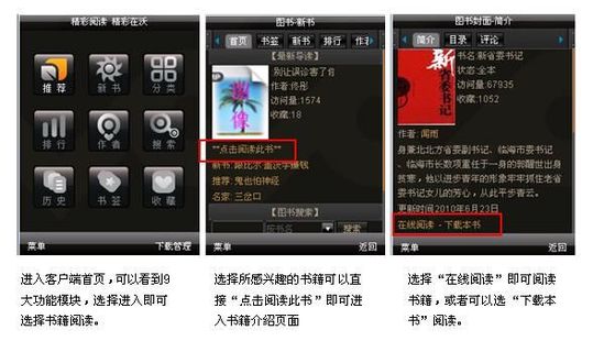 據(jù)了解,中國聯(lián)通手機(jī)閱讀業(yè)務(wù)分為三個專區(qū)。目前,圖書頻道包括16類24000余本圖書,雜志頻道包括17類500余本雜志。此外,用戶可選擇進(jìn)入聽書頻道,下載并收聽圖書。