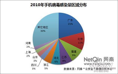 北京時間12月14日消息 近日,北京網(wǎng)秦天下科技有限公司(以下簡稱網(wǎng)秦)發(fā)布了《2010年中國大陸地區(qū)手機安全報告》[下載]。報告指出,據(jù)網(wǎng)秦“云安全”數(shù)據(jù)分析中心統(tǒng)計:截至2010年11月,新增手機病毒1513個,累積病毒數(shù)量達2357個。預(yù)計2010年手機病毒總數(shù)將超過2500種以上,同比增長193%,累計感染手機800萬部以上。其中,我國廣東地區(qū),以21%的感染比例位居首位,北京,上海,福建、江蘇等地位居其后。