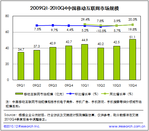 根據(jù)艾瑞咨詢(xún)即將發(fā)布的2010年第四季度中國(guó)移動(dòng)互聯(lián)網(wǎng)市場(chǎng)監(jiān)測(cè)數(shù)據(jù)顯示,2010Q4中國(guó)移動(dòng)互聯(lián)網(wǎng)市場(chǎng)整體規(guī)模達(dá)到51.1億,同比增長(zhǎng)19.8%,環(huán)比增長(zhǎng)20.3%。艾瑞咨詢(xún)分析認(rèn)為,本季度電信運(yùn)營(yíng)商對(duì)計(jì)費(fèi)通道治理開(kāi)始收尾,移動(dòng)增值市場(chǎng)整體復(fù)蘇。同時(shí)手機(jī)電子商務(wù)、手機(jī)游戲業(yè)務(wù)領(lǐng)域取得良好市場(chǎng)表現(xiàn),受手機(jī)應(yīng)用商店、位置簽到服務(wù)等新型手機(jī)業(yè)務(wù)創(chuàng)新的帶動(dòng),移動(dòng)互聯(lián)網(wǎng)規(guī)模總體攀升,投融資比重增加。