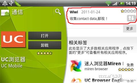 目前,很多手機(jī)社交應(yīng)用中加入了對用戶關(guān)系的抓取,這些應(yīng)用在用戶需要尋求社交關(guān)系時,將讀取用戶通訊錄中的信息,并進(jìn)行自動匹配。其中包括手機(jī)廠商HTC的HTCSENSE,UCWEB中的UC樂園,以及最近火熱的kik類應(yīng)用,如KikMessenger,米聊、微信等。多數(shù)用戶表示對于此種抓取通訊錄的行為表示疑慮。