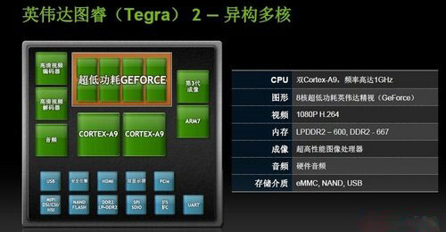 而英偉達圖睿Tegra 2就是專為移動市場而設(shè)計的超級芯片,Tegra 2雙核處理器采用了40納米工藝制程,有兩顆Cortex-A9處理器,主頻高達1GHz。Tegra 2處理器芯片只有1/4個硬幣大小,雙核以更低的功耗實現(xiàn)同等性能,多任務處理速度提升一倍,尤其是處理Flash以及HTML5的速度最快。