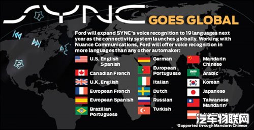 2007年SYNC在北美市場推出三國語言。新增的16國語言由Nuance提供,將支持語音識別,支持語種數(shù)量領先于所有其他汽車廠商。