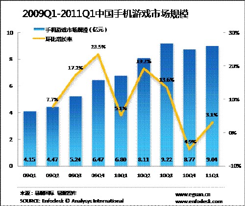 2011年第1季度手機游戲市場規(guī)模達9.04億元