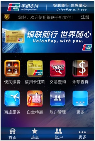 圖:銀聯(lián)手機支付客戶端軟件主菜單