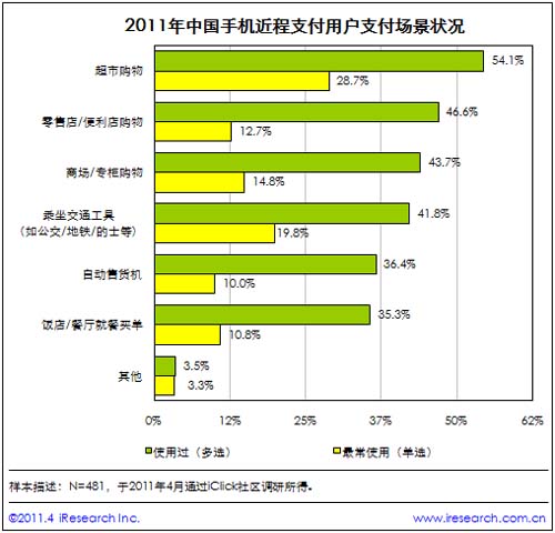 艾瑞咨詢:中國(guó)手機(jī)近程支付場(chǎng)景主要為超市和便利店